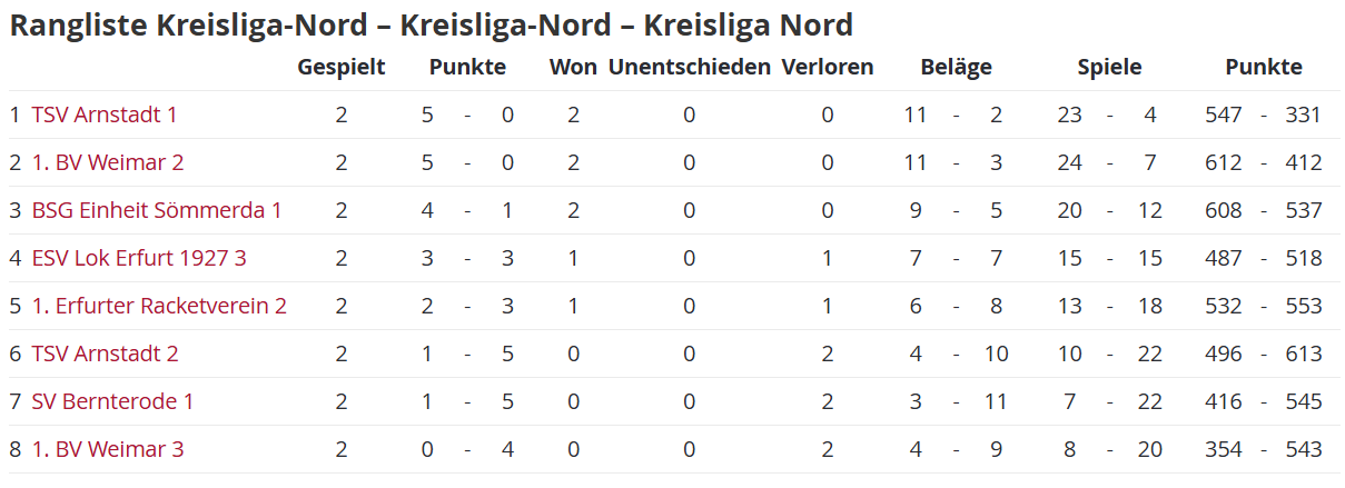 Hier ist der Tabellenstand nach den am 21.09.2025 in der Nordstraßenhalle in Weimar erspielten Ergebnissen; die Ergebnisse der einzelnen Spiele sind HIER dargestellt: