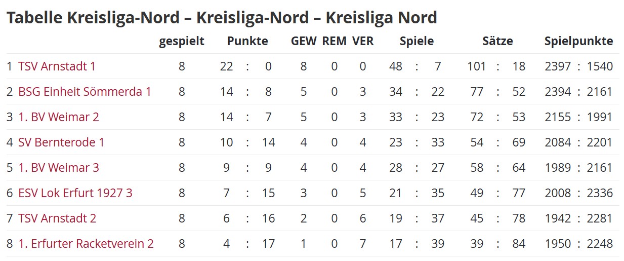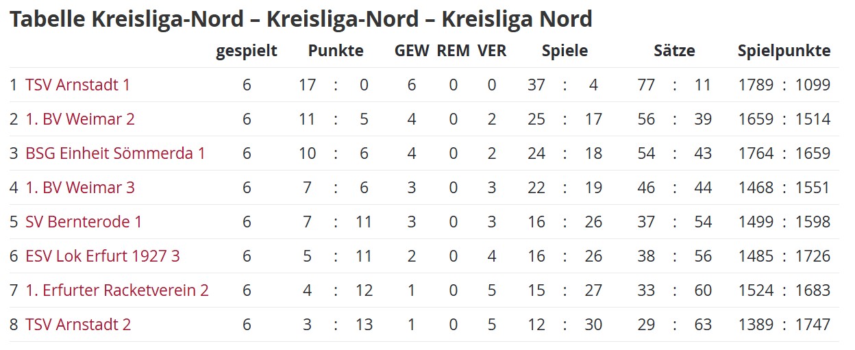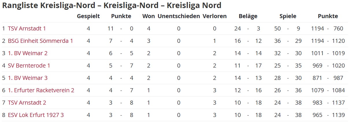 Hier ist der Tabellenstand nach den am 30.11.2025 in der Weimarer Nordstraßenhalle erspielten Ergebnissen; die Ergebnisse der einzelnen Spiele sind unter www.turnier.de (HIER klicken) dargestellt: